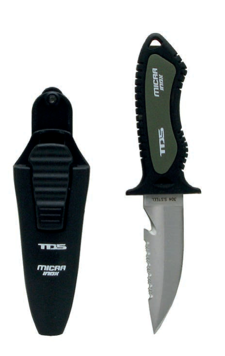 Συμπαγές μαχαίρι, έκδοση από ανοξείδωτο ατσάλι, λεπίδα με λεία άκρη, πριόνι και κόφτης πετονιάς, υπεραρκετό για καταδύσεις αναψυχής. Περιλαμβάνει διαφορετικούς τύπους λαβών