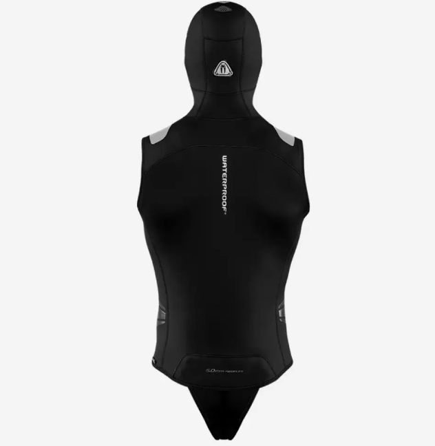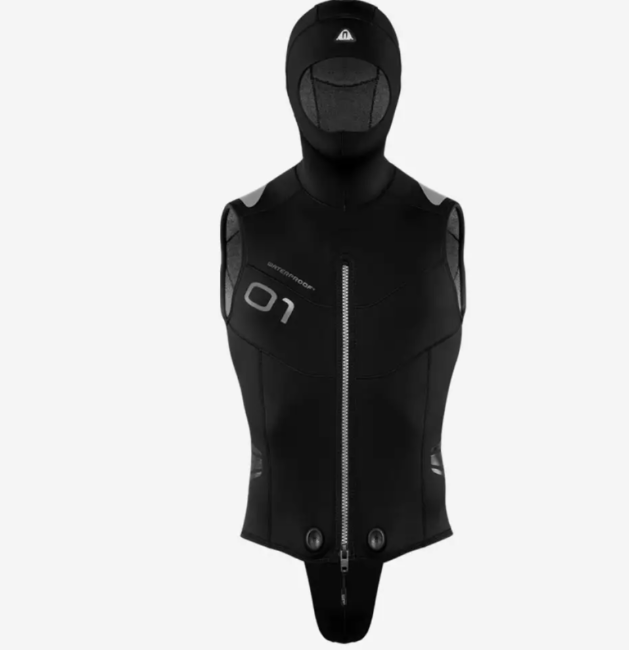O1 5MM HOODED DIVING VEST. A 5mm neoprene vest. A 5mm hooded vest that offers extra warmth and comfort to your dives. Extremely soft and flexible thanks to the comfortable super stretch neoprene. It features a front zip and a fixed 7mm hood. The O1 is a member of Waterproof's new Neoflex range, a great complement to wear over your regular wetsuit during dives. The O1 vest has a detachable tail with double Velcro. The thermal lining adds a softer, warmer and more comfortable feel. Anti-slip surfaces on the shoulders and waist keep the BCD and weight belt in place. The zipper is equipped with EasyGrip for easy opening and closing.